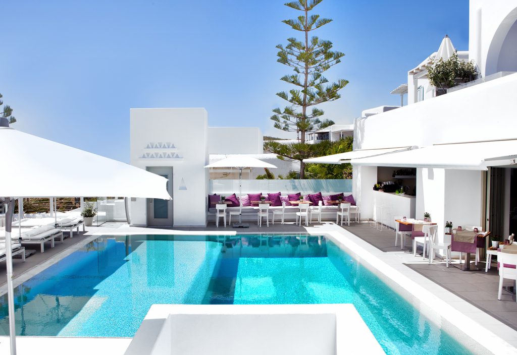 Her bor du i rom, suite eller familiesuite – eller i bryllupssuiten. Rommene er innredet i svalt hvitt og har luksuriøst utstyr og balkonger med uslåelig utsikt. Om kvelden spiser du herlig middelhavsmat med et gresk preg, elegant presentert ved det glitrende bassenget. Eller nyt Mykonos’ hektiske natteliv.