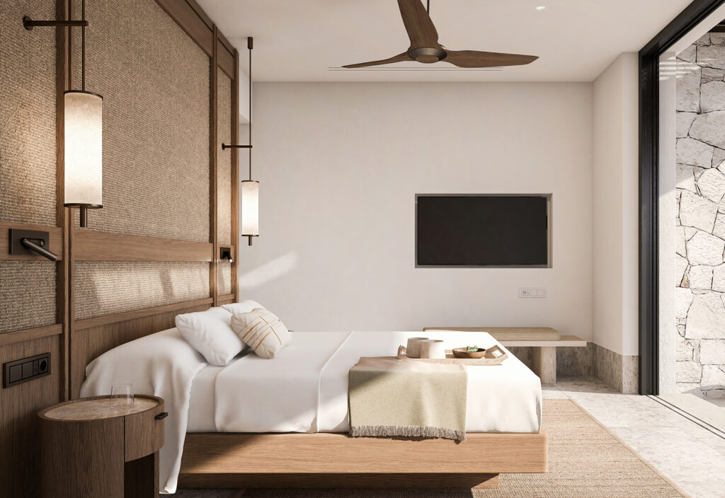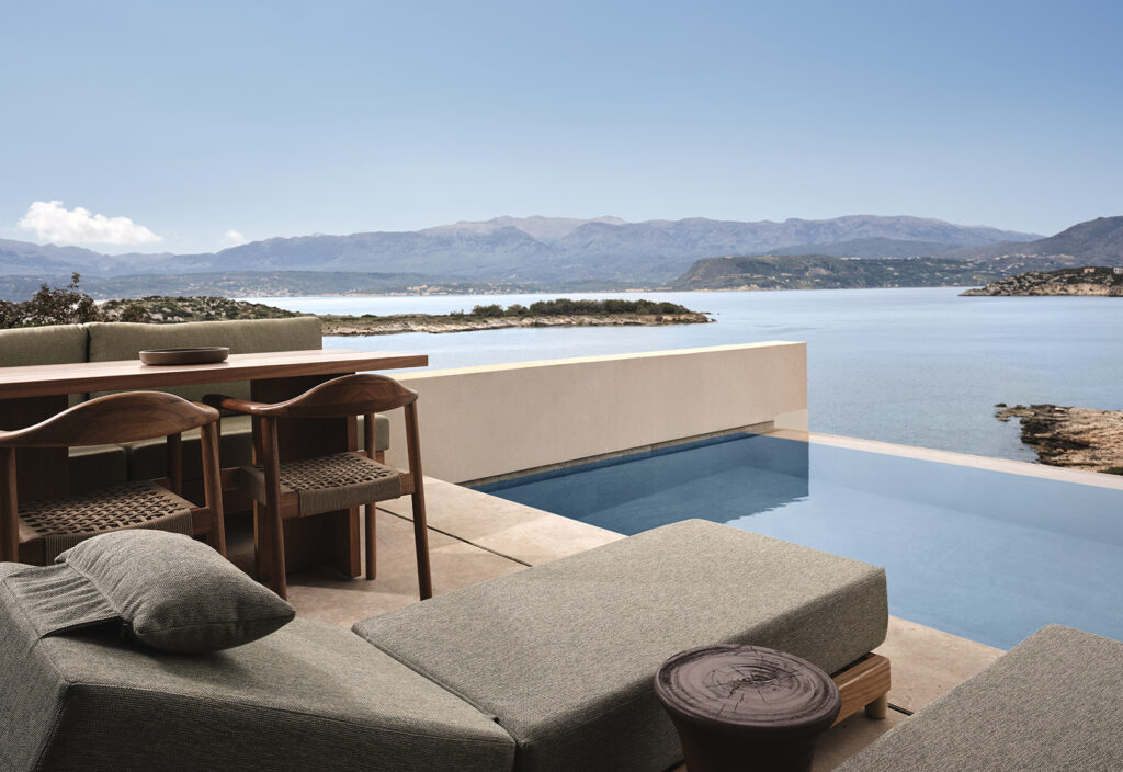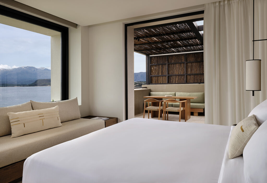 Alle rom, suiter og villaer har utsikt over bukten, som hele dagen krysses av store og små båter. Det finnes mange forskjellige romkategorier, og spesielt populære er «swim-up-rommene», som gir direkte tilgang til ditt eget private basseng. Stilen er en elegant blanding av skandinavisk og gresk. Fargene er hvite, beige og brune nyanser. Hvis du ønsker ditt eget private basseng, anbefaler vi juniorsuitene. For større familier har de sjarmerende villaer med to soverom.