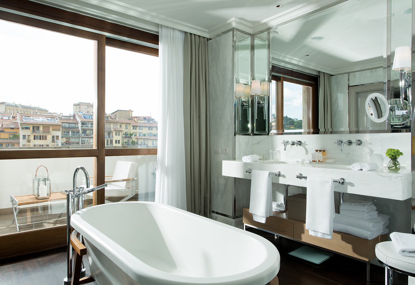 273 m² stor penthouse-leilighet. Det bølgende vannet i Arno og den tidløse Ponte Vecchio, innrammet av vinduene i stuen og soverommet ditt, gjenspeiler samspillet mellom fortid og nåtid i interiørdesignet. Klassisk og moderne smelter sammen når varme tresorter og dempede gråtoner bader i glansen fra forgylte detaljer og glitrende stål. Myke materialer og koselig kashmir skaper en aristokratisk, men likevel avslappende atmosfære.