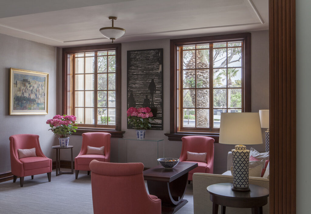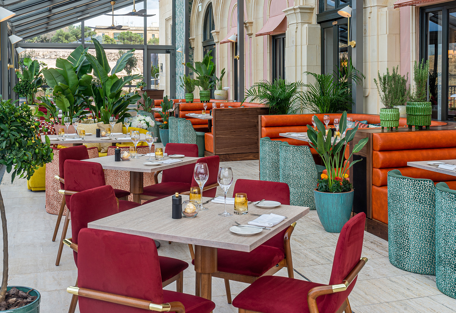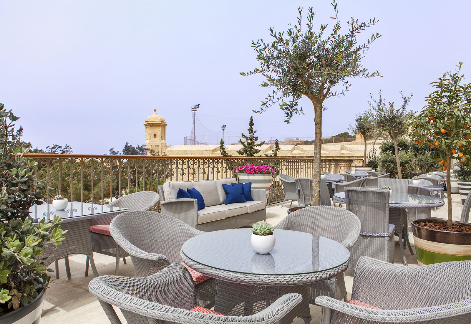 Hotellet er omgitt av 7,5 hektar med terrassehager, med utsikt over havnen og Vallettas historiske murer. Her finnes fredelige gangstier, utsiktspunkter og den ikoniske Bastion Pool, som er hugget direkte inn i bymuren – et av Maltas aller første svømmebassenger. Palm Court Lounge er hotellets elegante hjerte – et historisk møtested som serverer klassisk ettermiddagste, cocktailer og lette retter i en atmosfære som kombinerer sofistikert historie med avslappet eleganse. Ettermiddagste er en av hotellets signaturerfaringer, med håndlagde kaker og scones. 1200 kvadratmeter stort spa- og wellness-avdelning integrert i en autentisk mur fra 1500-tallet.