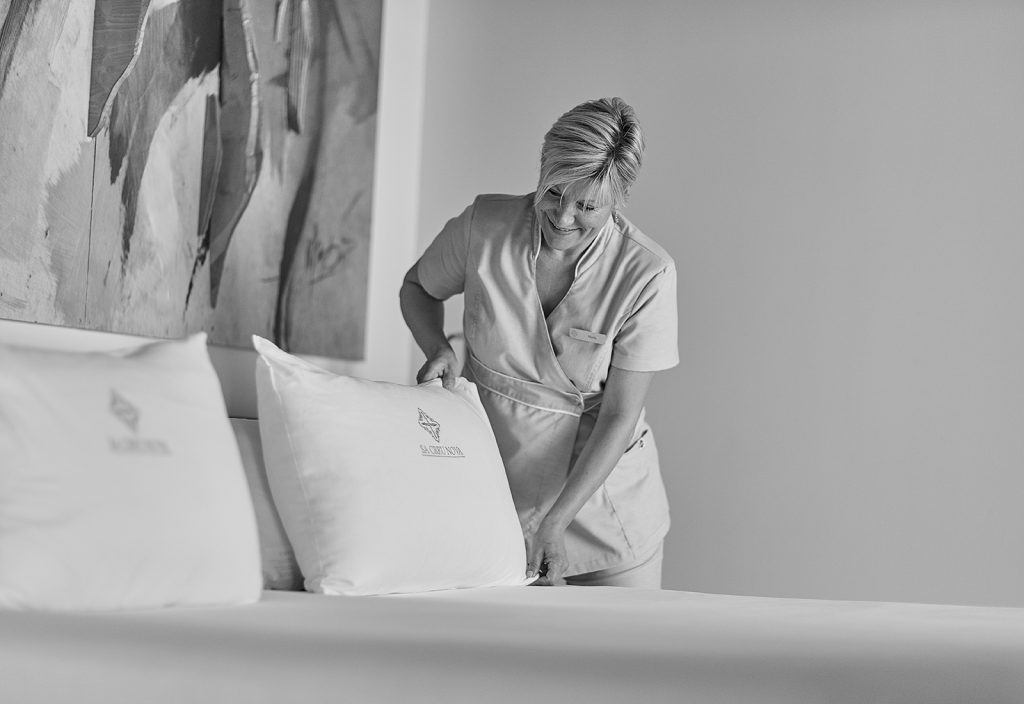 Gammelt møter nytt, sandsteins- og fiskebeinsparkett, glassdører og murvegger med hundrevis av år bak seg. Legg til litt abstrakt kunst, stilige møbler og eksklusive tekstiler og det begynner å ligne på noe. Vi legger til et til tider litt skamløst bad med myke badekåper, gratis WiFi og i noen rom en uteplass.