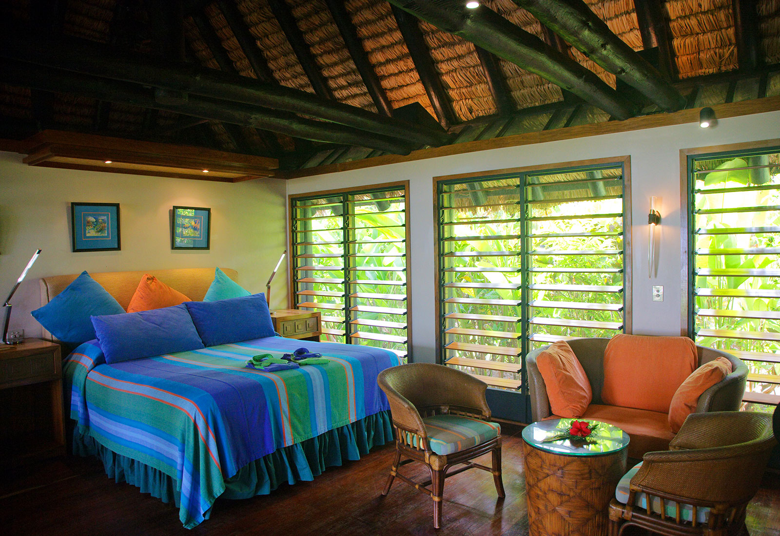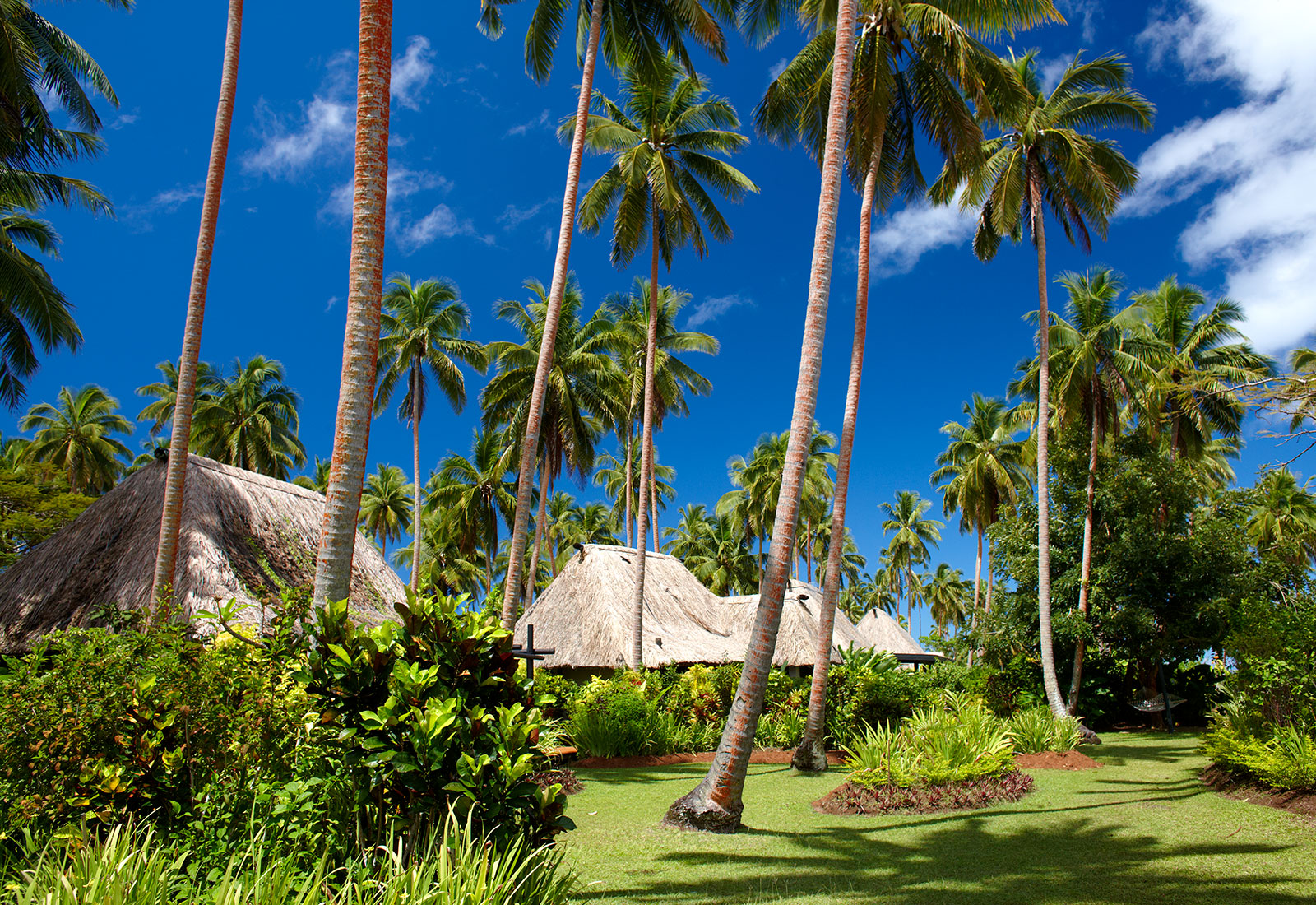 Feriestedet er bygget i en tidligere kokosnøttplantasje, av lokalt tømmer, som tradisjonelle fijianske hus med en genuin atmosfære. Du er uforstyrret, har godt med plass, privat treterrasse med flott utsikt og stort bad. På kveldene kan du spise utendørs på feriestedets prisbelønte restaurant. Og hver uke er det Fiji-fest!